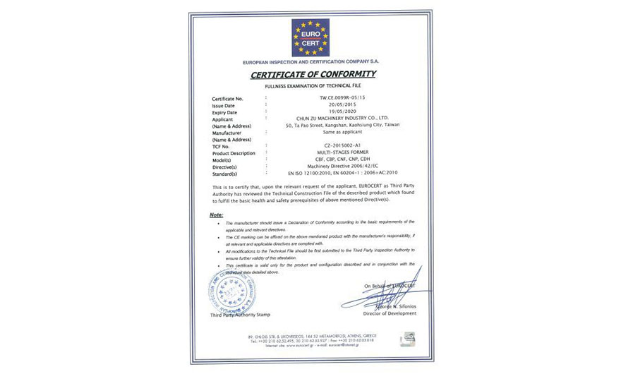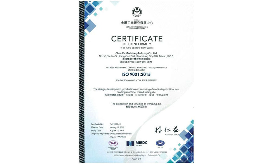 本公司已通過ISO 9001:2015品質管理系統新版標準國際驗證,自1995年連續24年通過ISO稽核,藉由ISO對標準作業流程的認證,嚴格控管品質與製造為客戶提供更優良的產品與服務! 對於歐盟客戶,本公司產品通過歐盟CE認證,符合新版機械指令2006/42/EC,為客戶提供安全與優良的產品!